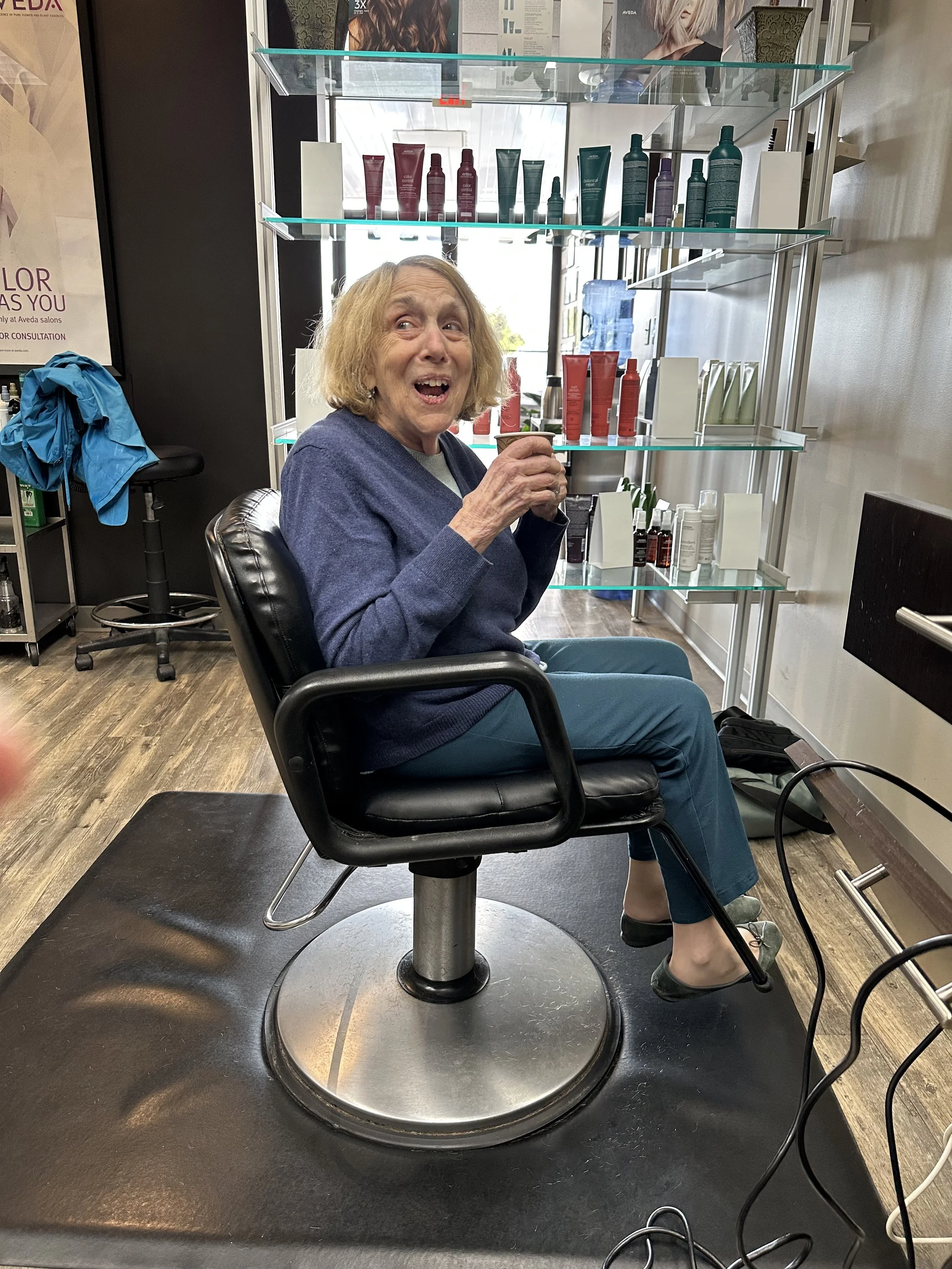It is Saturday afternoon and yesterday my mom who gets weekly blowouts from Al, who is hairdresser on call for goddesses like Liza M & Julie A on Broadway IS the artist who makes her ready for the bright lights of Syracuse each week. Let’s just say that mom was a little too confident. She wanted to drive, was feeling good and walked on her own even though I/we tried to assist. After the color, cut, and blow-dry we went for Chinese food and she hustled in and proceeded to step up onto an elevated floor where the booths were, trip, fall down and injure her right leg. Her good leg.