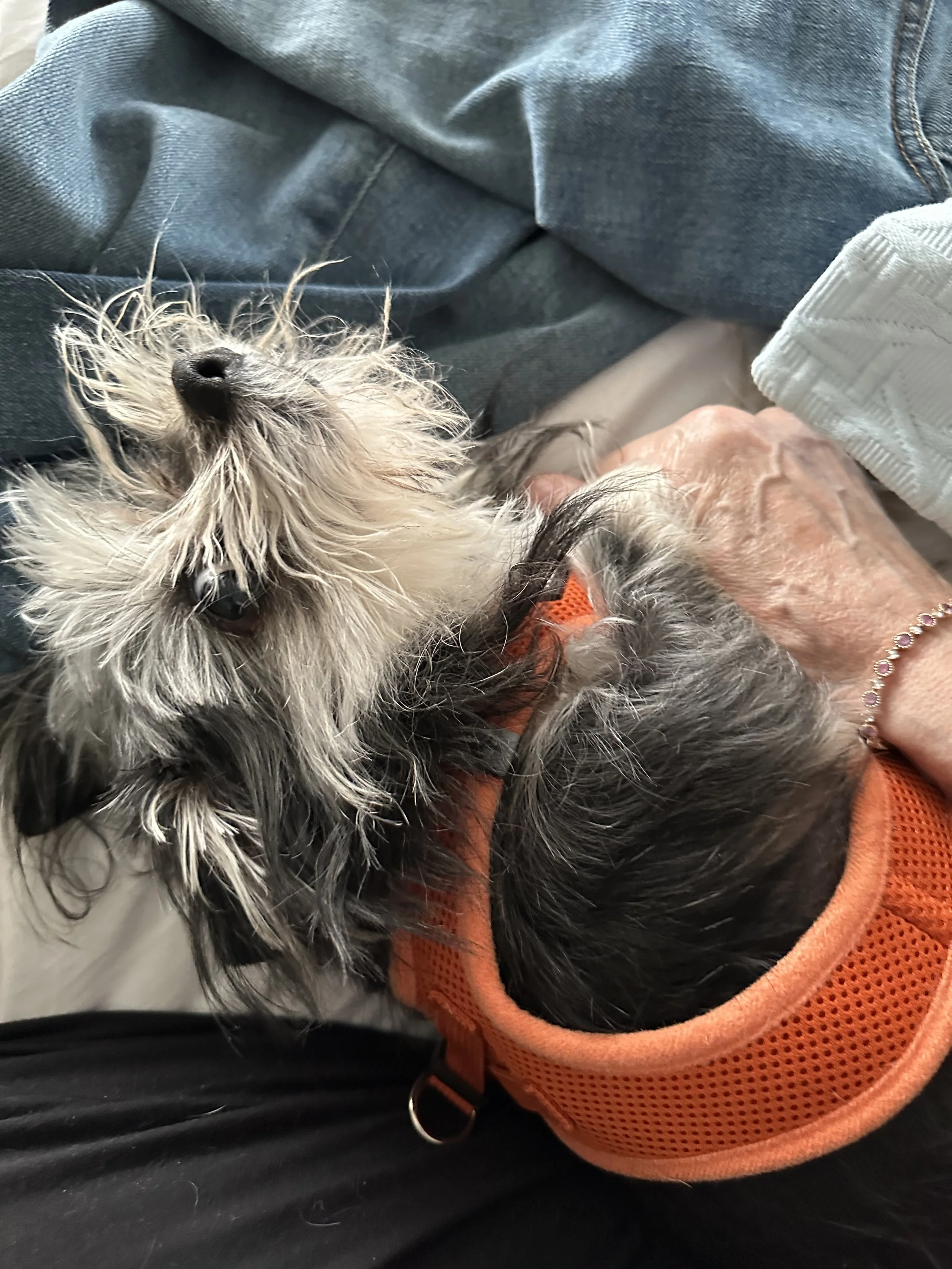 This is my mother’s second puppy mill rescue Milly, who spent the first two years of life in a cage. This morning she let me hold her and cuddle her, and as you can see even dress her. This anxious doggie melted into my arms and even refused a treat for more “keppy rubs”. Keppy is Yiddish for head. I understood her deep need for physical touch and to be held. It was three months after my birth that my mother was able to hold me for the first time. Once I grew to be 5 pounds in weight I could go home. I had lived in a glass cage, attended to by nurses but not held and loved.