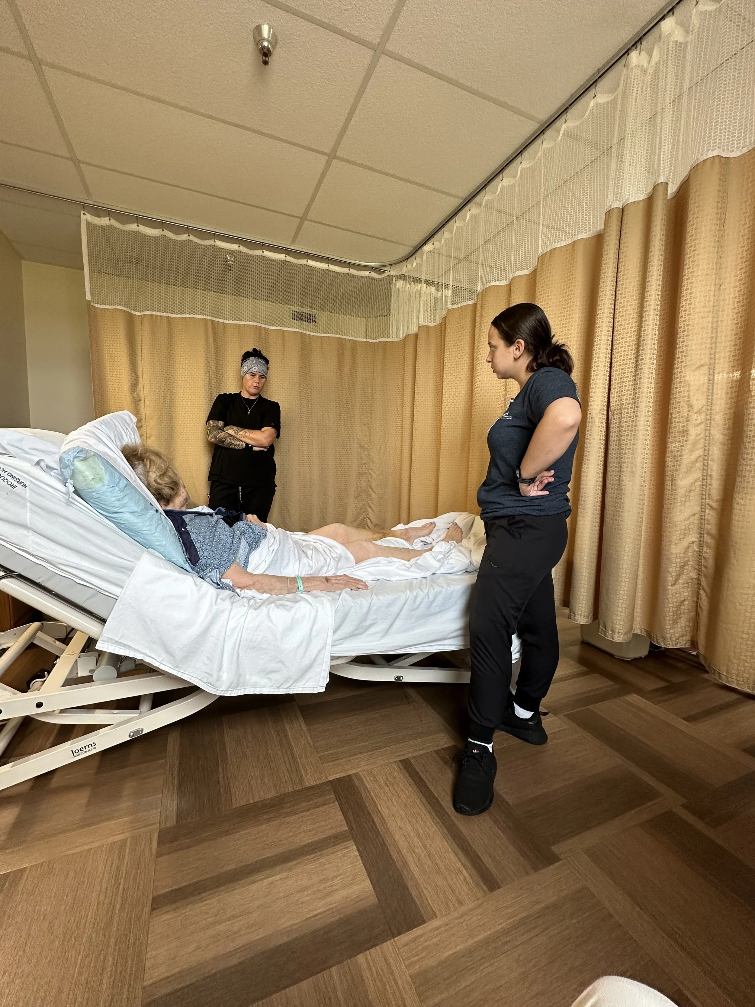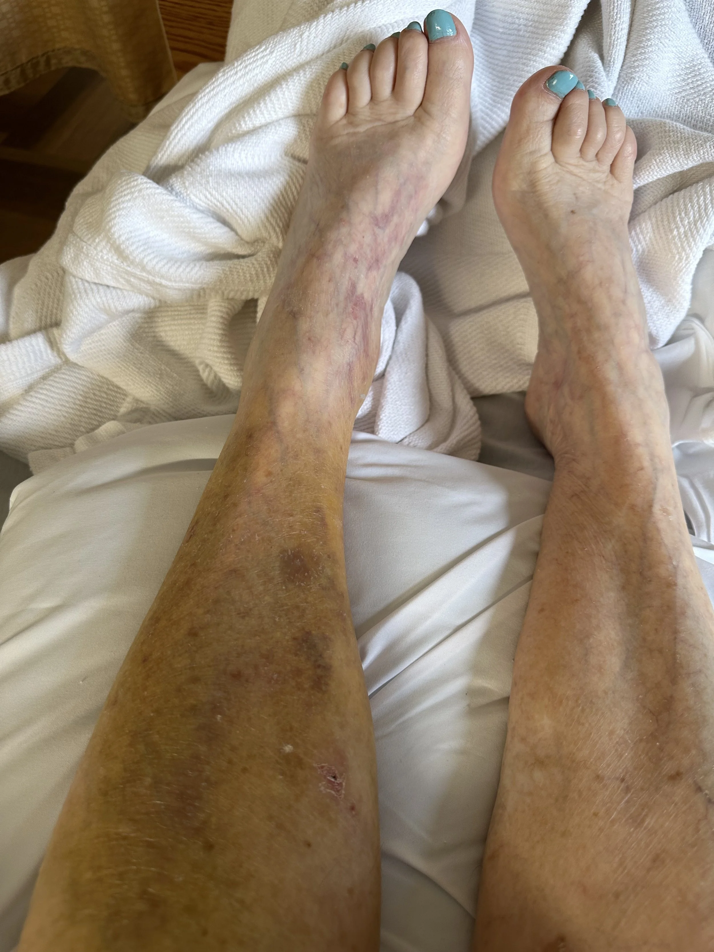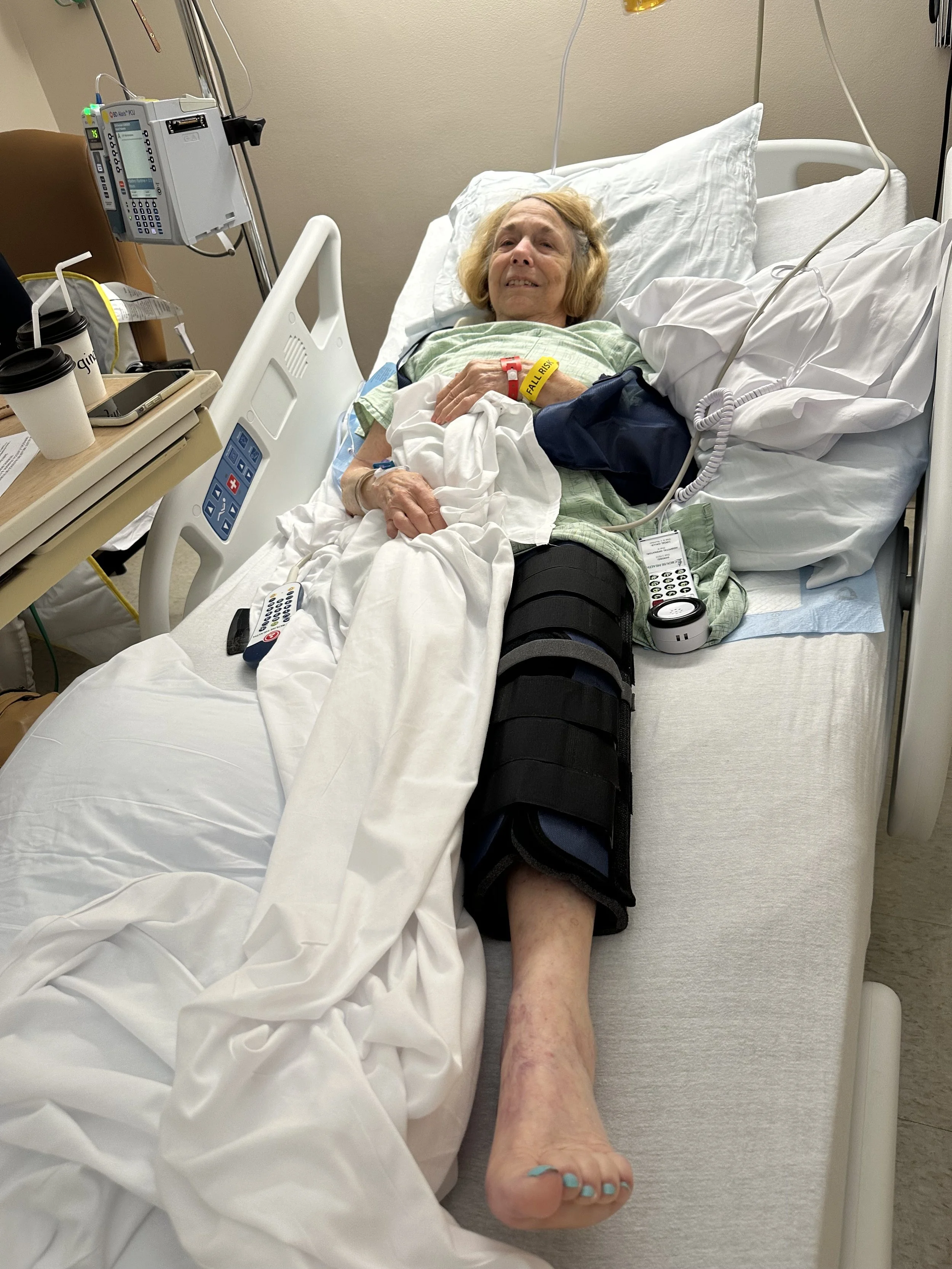 First I would like to note that my mom must have gotten a mani pedi right before she fell. So far she is the most fashionable patient in rehab and today is back in pajamas and not a hospital gown for the first time. For some reason it is VERY HOT there and everyone sweats, even the staff. We have been told we CAN bring a fan and CAN'T open a window and that maintenance HAS been informed.Yesterday when I took these pictures they were afraid her left foot also had a cracked bone due to the swelling, numbness, and limited Range of Motion. Because of that her OT/PT support team couldn’t do any weight-bearing work for her left leg which is now part of the order.