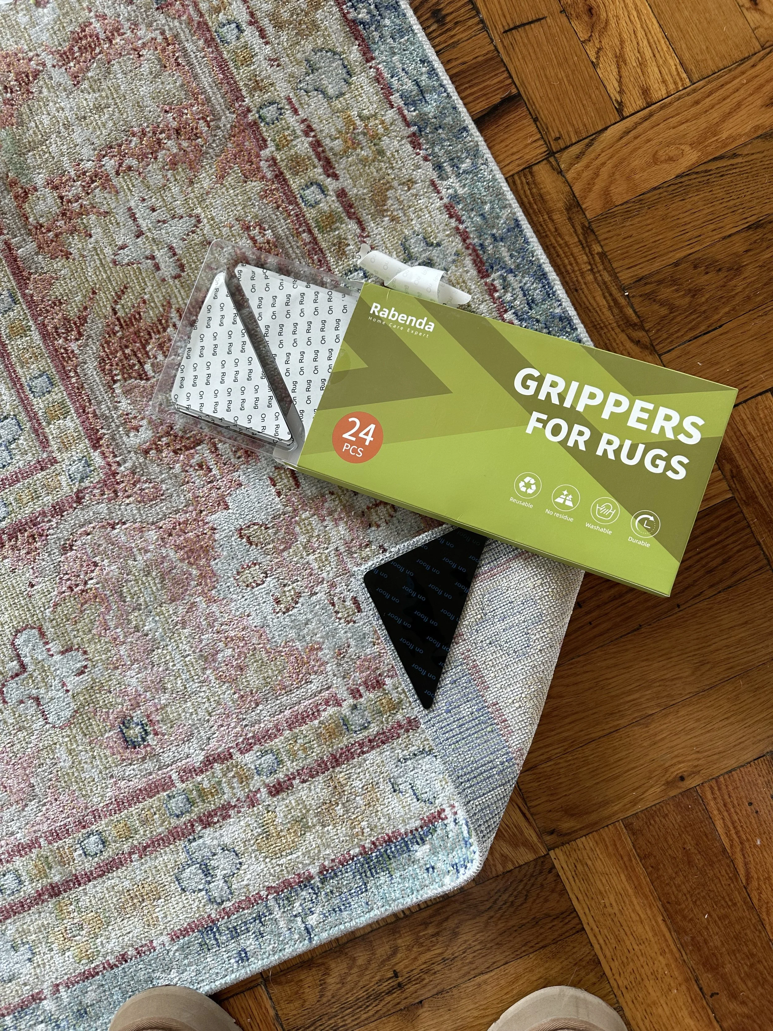 These rug grippers are amazing. They are super sticky and yesterday I was busy attaching them to every single rug corner in my new apartment so nobody and by nobody I mean my mom, will trip, fall, break, and have to spend several weeks mending in a rehab facility.