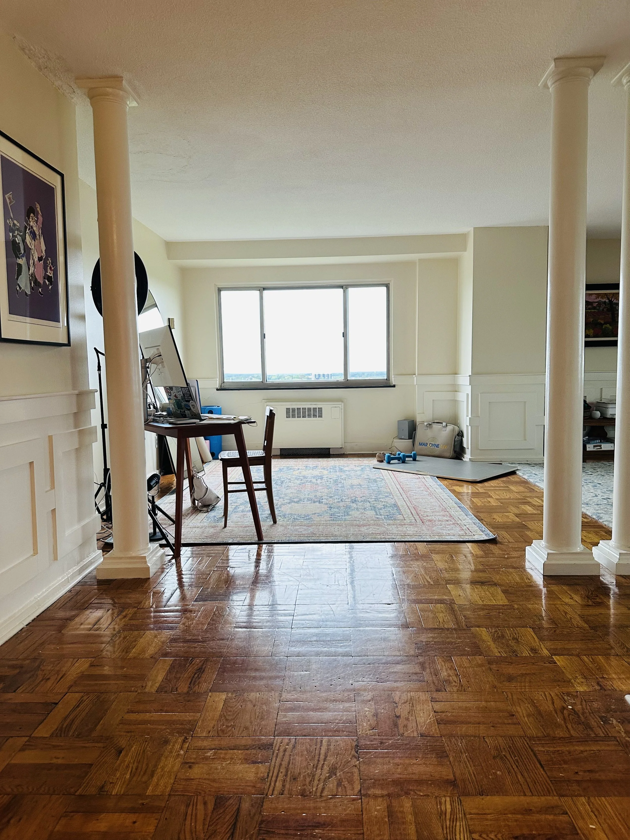 This is my new studio work space. The columns are a bit much but they were here (and there are 2 more) so I am going with the drama and am thrilled to have such a beautiful space to live and work in. It is a cloudy and rainy day here in Syracuse and I am trying to put the new pieces together of my life. What is my vision?