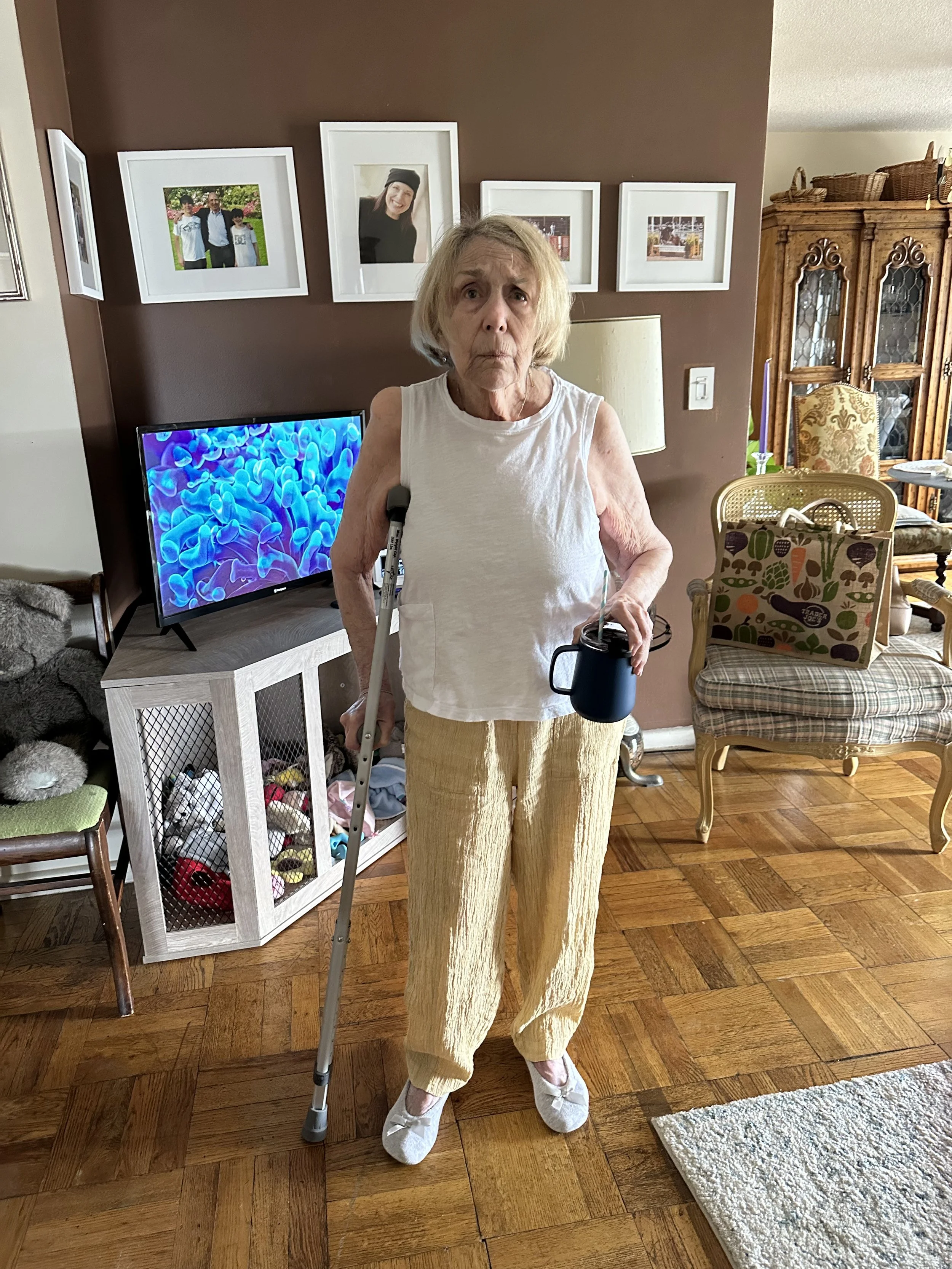 We got through dinner, I asked her/told her that she is like a porcelain doll and has to let me “spot” her and protect her. Seriously that is why I am here. I drove the car home, she is using a crutch but went right to bed. We are icing, using bio-freeze and all of the things that just helped her broken left side in rehab. I am also doing light therapy. She doesn’t want to eat and I am watering down apple juice and cutting things into mini bites. It took all day for her to eat a few apple slices and a cracker with peanut butter. That upset her stomach and she is living on papaya tablets.