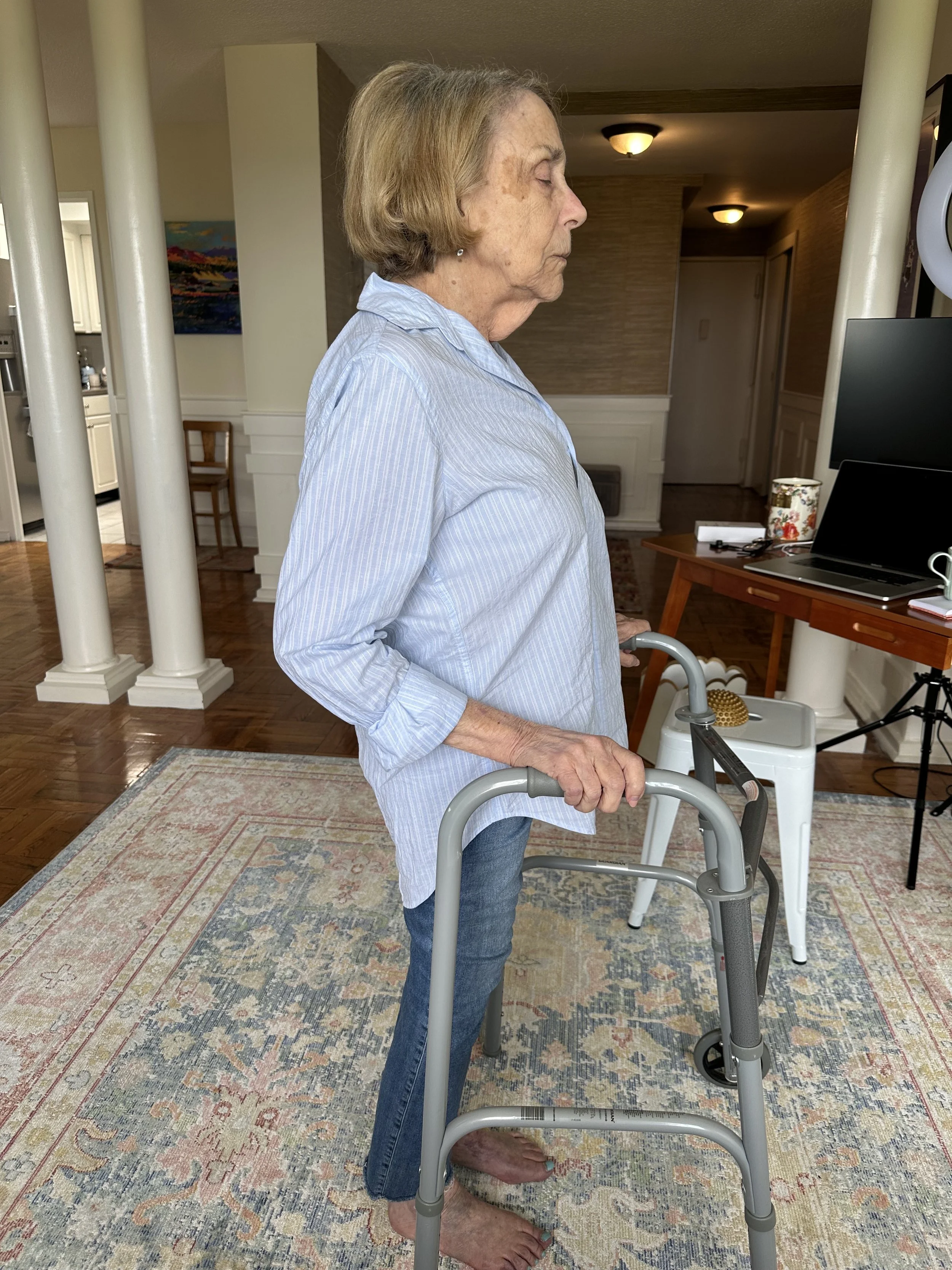 My mother has osteoporosis too, and has lost at least 6 inches of height. Her stomach is very high and it makes eating and digesting food a challenge. The compression and GERD are not things that come up in doctor or hospital visits but these are common when vertebral compression fractures put your internal organs into positions that they aren’t meant to go into. Have you ever tried to wear too tight clothes all day or close an over stuffed suit case? Imagine that these are the kinds of things being forced on your beautiful body when you have severe osteoporosis and don’t know that the posture you are living with is making it worse. …Now you have me,Mom.